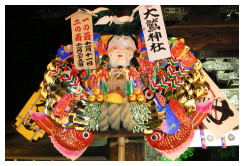 酉の市(とりのいち)は大鷲(おおとり)神社の祭礼で、11月の酉の日に行われます。