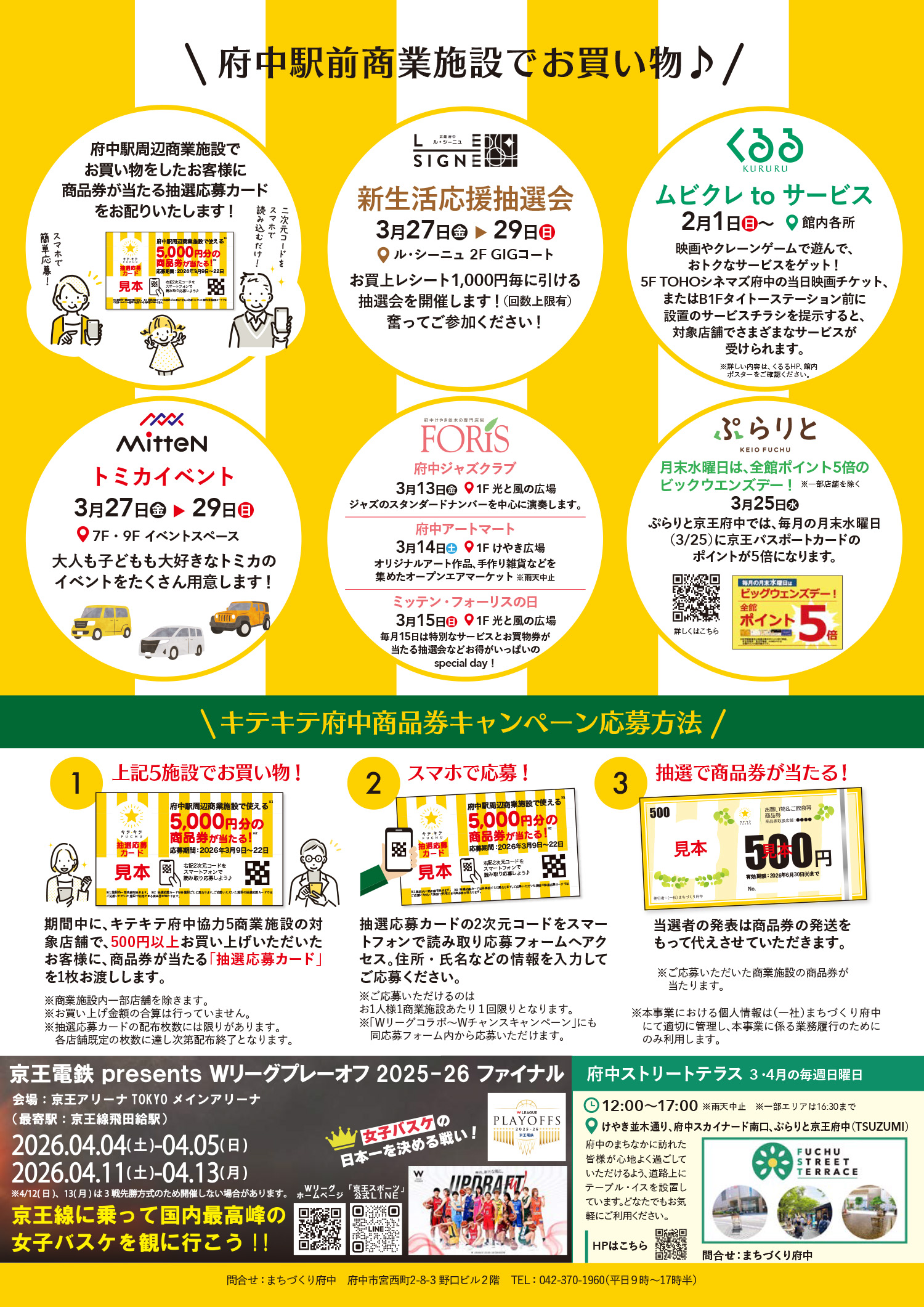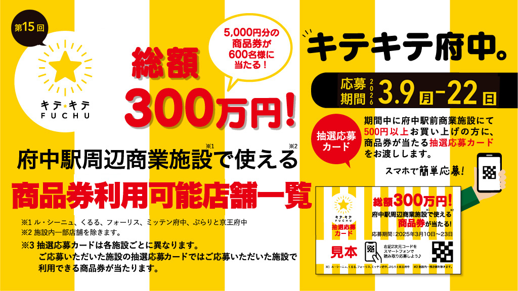府中駅周辺の商業施設でお買い物をして商品券を当てよう!3月9日よりキテキテ府中★商品券キャンペーン2026開催!