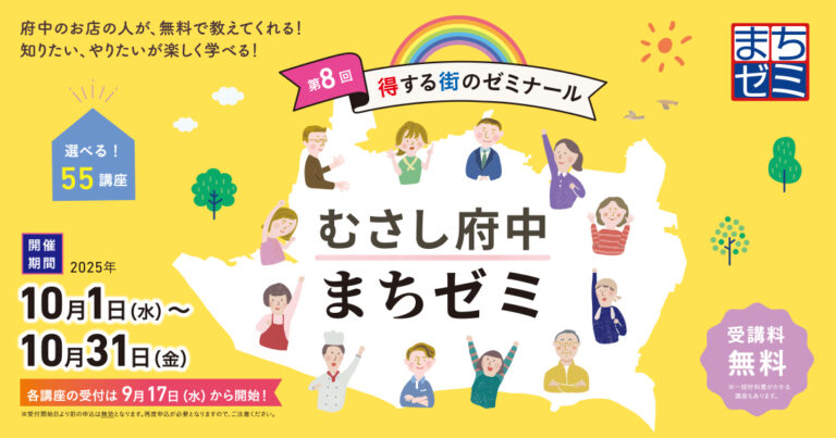 府中で8回目となる「まちゼミ」が10月に開催! 府中のまちなかにあるお店が、それぞれの得意を活かした無料の講座を開く「まちゼミ」。※一部材料費あり第8回目となる今回も、2025年10月に開催いたします!その道に精通してい … 続きを読む 「第8回むさし府中まちゼミ2025」の開催について